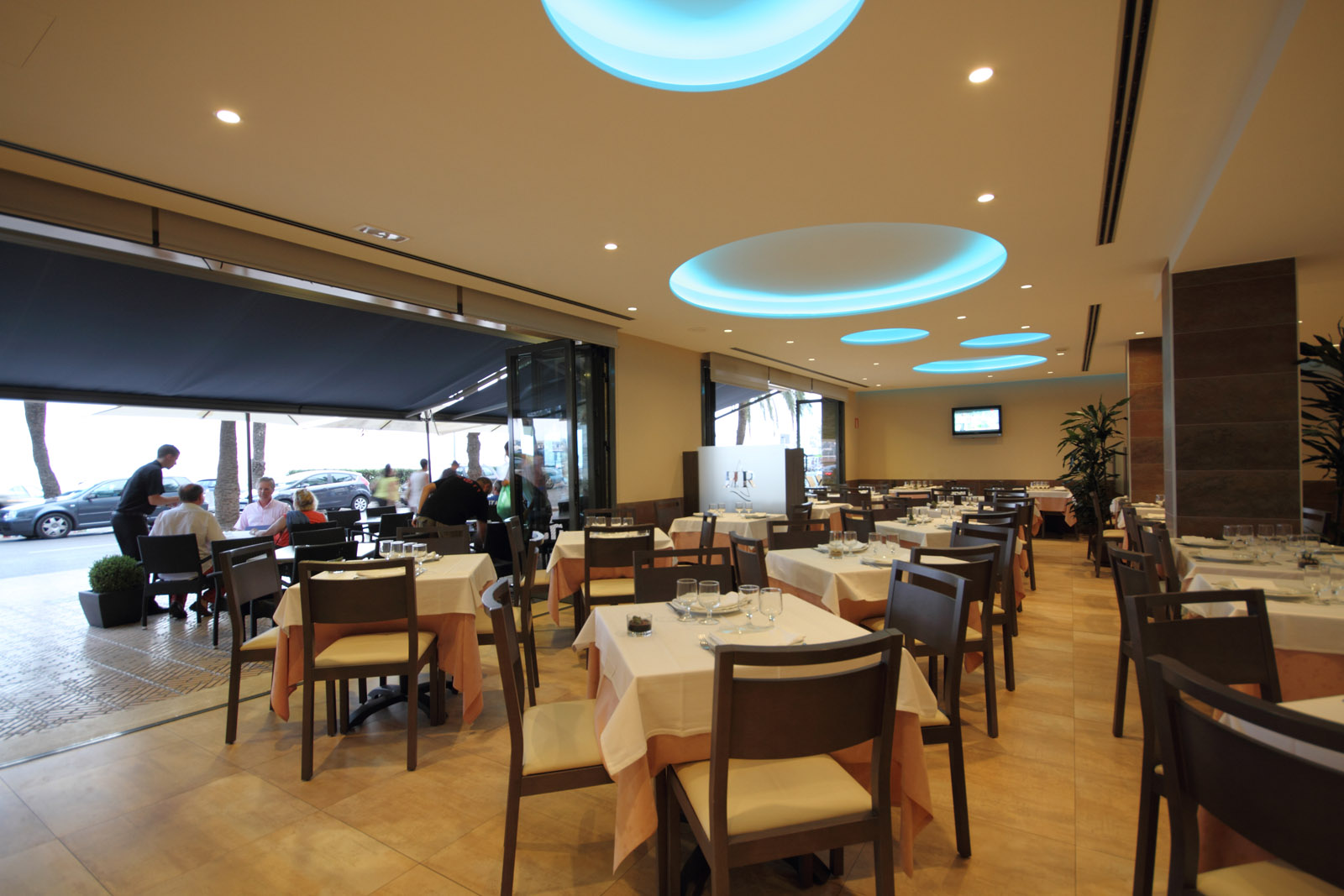 El restaurante dispone de dos zonas diferenciadas, la moderna e interior o su excelente terraza en la misma y animada Avenida Rhode frente al Mar.